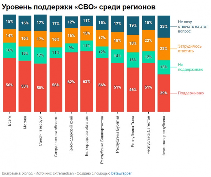 Согласно данным ExtremeScan, сильнее всего войну поддерживают в регионах, которые находятся ближе к зоне боевых действий – в Белгородской области (63%) и Краснодарском крае (62%).