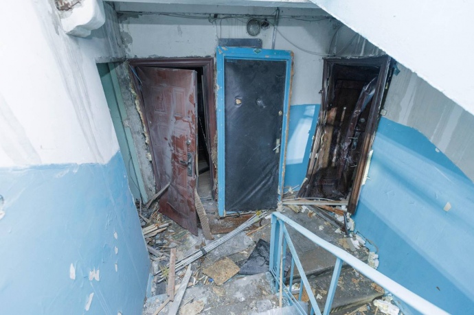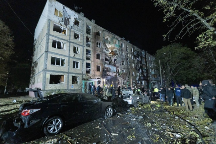Прямая речь Синегубова: "В результате обстрела горели конструктивные элементы дома и 2 автомобиля. Разрушена фасадная часть 5-ти этажного жилого дома, квартиры на 4, 5 этажах, повреждены 10 автомобилей.