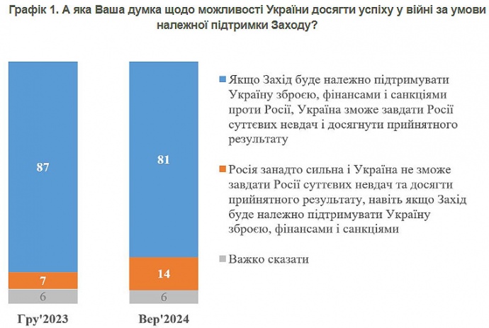 Абсолютное большинство украинцев – 81% – продолжают верить, что Украина способна достичь успеха в войне, если Запад будет должным образом поддерживать.