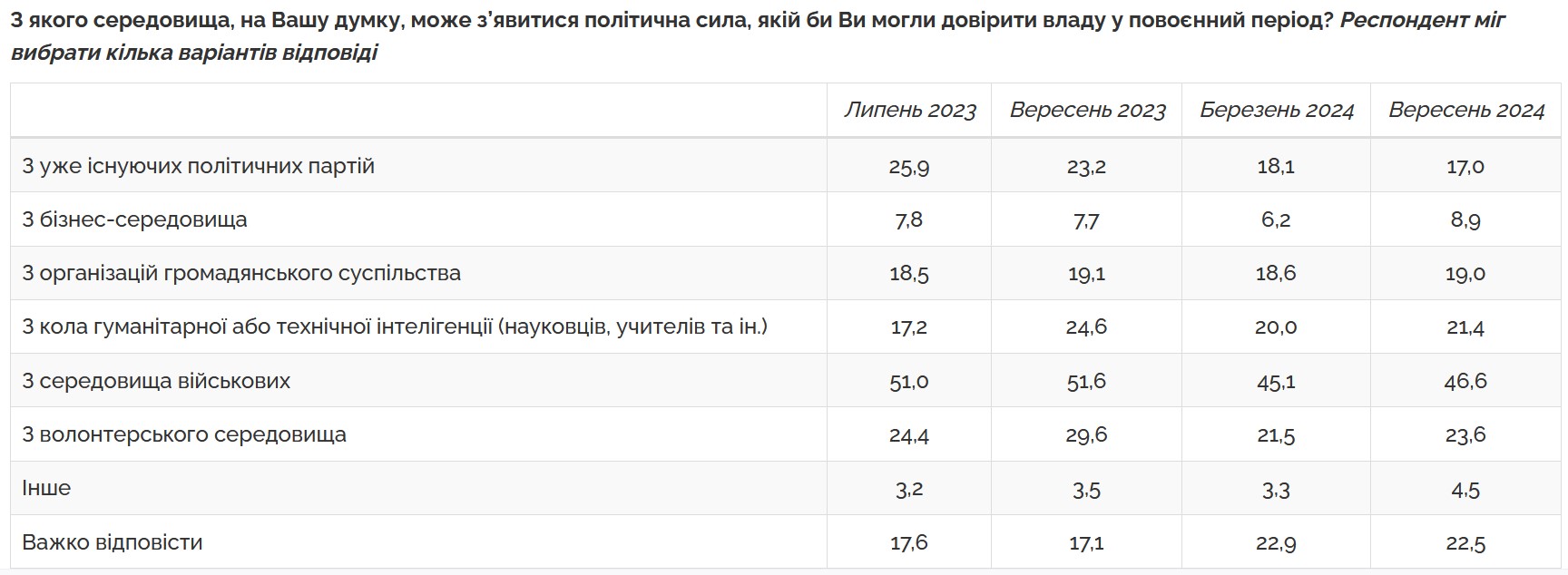 Дословно: "Политическая сила, которой можно доверить власть в послевоенный период, чаще всего, по мнению граждан, может появиться из среды военных (так считают 47% опрошенных)".