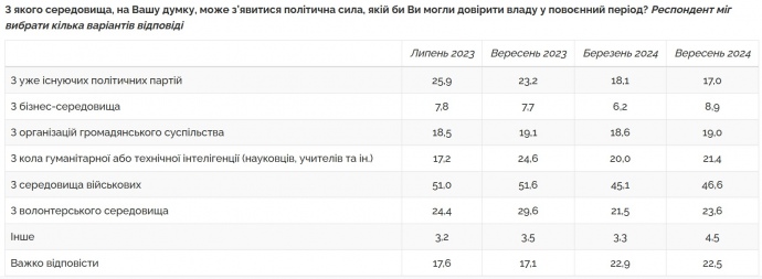 Детали: В то же время, согласно результатам исследования, 24% респондентов придерживаются мнения, что власть может появиться из волонтерской среды, 21% – из круга гуманитарной или технической интеллигенции, 19% – из организаций гражданского общества, 17% – из уже существующих политических партий, 9% – из бизнес-среды.