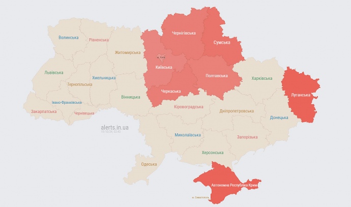 По состоянию на 2:45 воздушная тревога объявлена в столице, Киевской, Черниговской, Сумской, Черкасской и Полтавской областях.