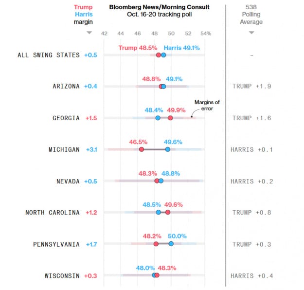 Детали: Данные исследования свидетельствуют, что Харрис и Трамп имеют по 49% поддержки каждый в 7 штатах (Аризона, Джорджия, Мичиган, Невада, Северная Каролина, Пенсильвания и Вашингтон). Статистическая погрешность опроса – 1%.