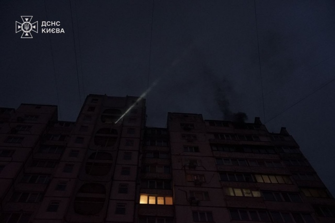 В 6:49 в ГСЧС Киева сообщили, что в результате атаки БпЛА произошло возгорание на площади 50 кв. м и частичное разрушение в квартирах на 15 и 16 этажах, 16-этажного жилого дома в Святошинском районе города.