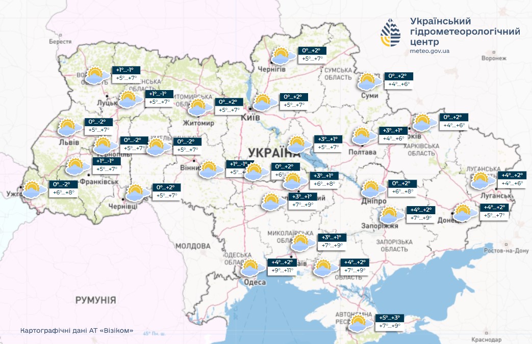 Температура ночью от 3° тепла до 2° мороза, днем 3-8° тепла; в Киеве ночью 1-3° тепла, днем 5-7° тепла.