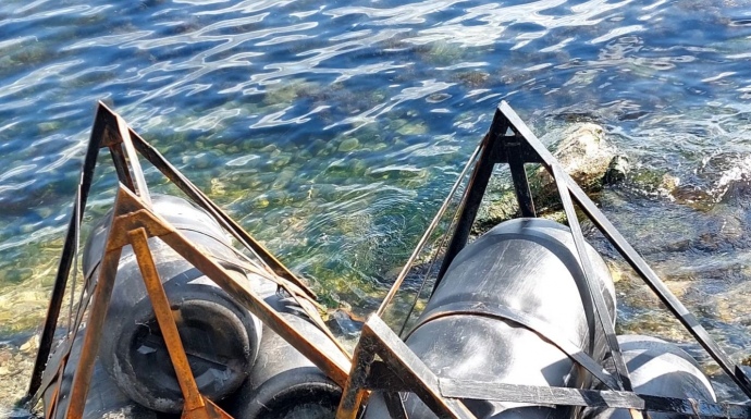 Детали: Как сообщает местный корреспондент проекта, на городской набережной скопились остатки боновых заграждений - пустые баки, уложенные в конструкции из арматуры.