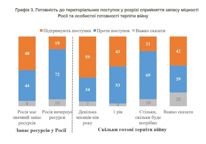 По данным опроса, среди тех, кто соглашается терпеть войну несколько месяцев-полугода, 59% готовы к территориальным уступкам, среди тех, кто готов терпеть 1 год - 43%, а среди тех, кто готов терпеть столько, сколько потребуется - 21%. В то же время с 34% до 69% растет доля тех, кто категорически против никаких уступок.