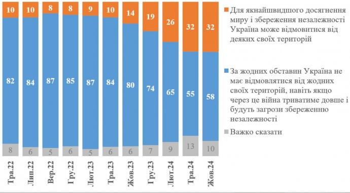 По состоянию на начало октября 2024 года, несмотря на все сложные обстоятельства, большинство украинцев, или 58% выступали против никаких территориальных уступок.