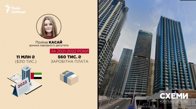 Полина Касай, на тот момент 22-летняя дочь нардепа "Слуги народа", купила двухкомнатную квартиру в жилом комплексе Dubai Gate 2 за 310 тысяч долларов (около 9 миллионов гривен на момент покупки).