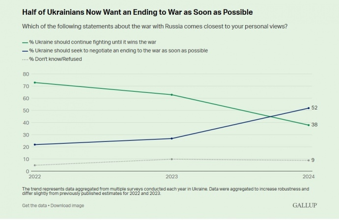 Дословно: "После более чем двух лет конфликта украинцы все больше устают от войны с Россией. Согласно последним опросам Gallup в Украине, проведенным в августе и октябре 2024 года, в среднем 52% украинцев хотели бы, чтобы их страна как можно быстрее договорилась о прекращении войны.