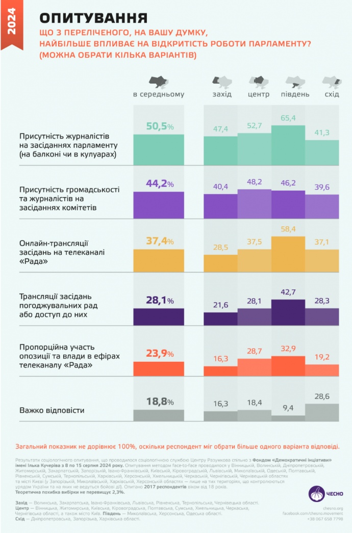 Медийщики также приводят опрос, который проводился социологической службой Центра Разумкова совместно с Фондом "Демократические инициативы" имени Илька Кучерива. Согласно ему, более 50% граждан Украины считают, что открытость парламента зависит от присутствия журналистов в кулуарах или ложах для прессы, что опережает даже онлайн-трансляции заседаний.
