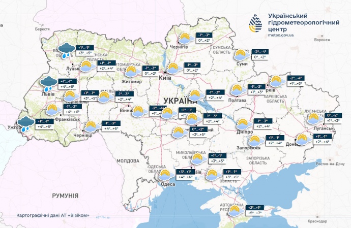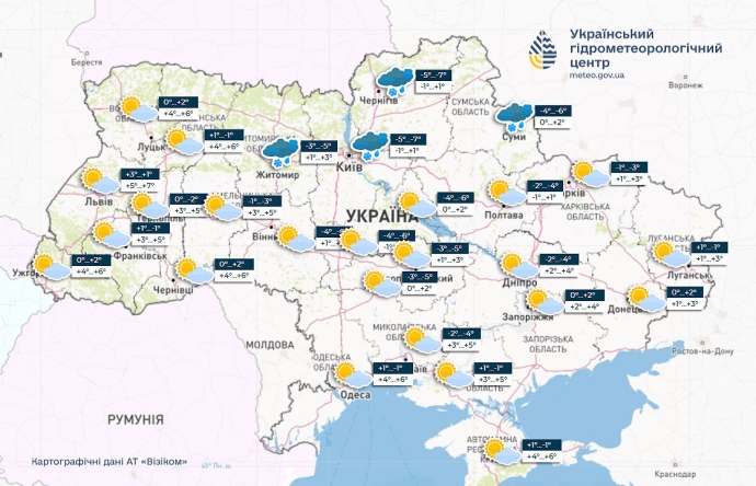 Дословно УГМЦ: "27 ноября температура ночью 3-8° мороза, на западе и юго-востоке страны около 0°, днем от 2° мороза до 3° тепла, в западных областях, в Одесской области и в Крыму 2-7° тепла. В западных, северных и Винницкой областях на дорогах местами гололедица. Ветер переменных направлений, 3-8 м/с".