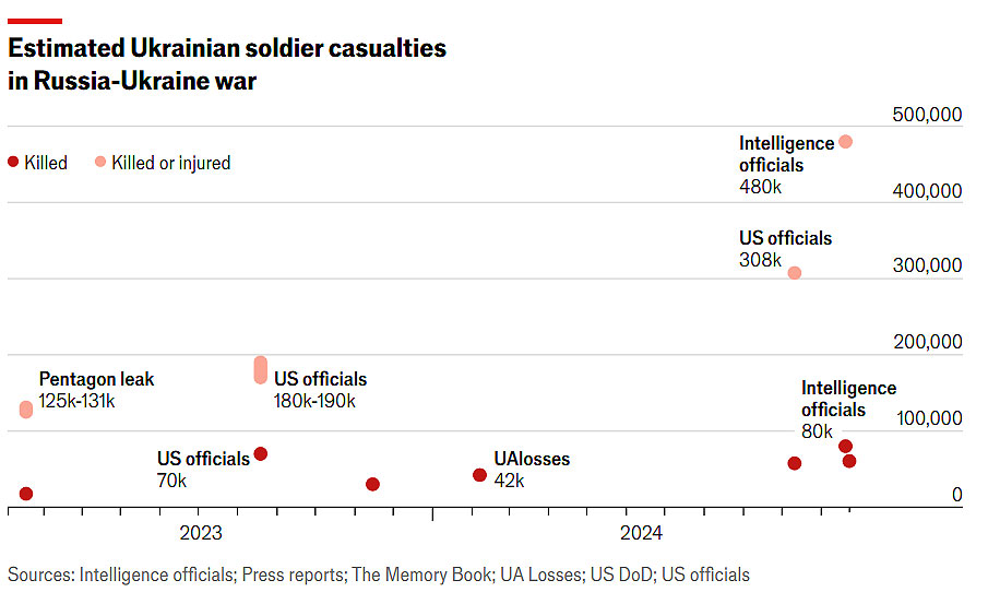 Издание также ссылается на данные веб-сайта UAlosses, согласно которым с 2022 года погибло по меньшей мере 60 435 украинских солдат.