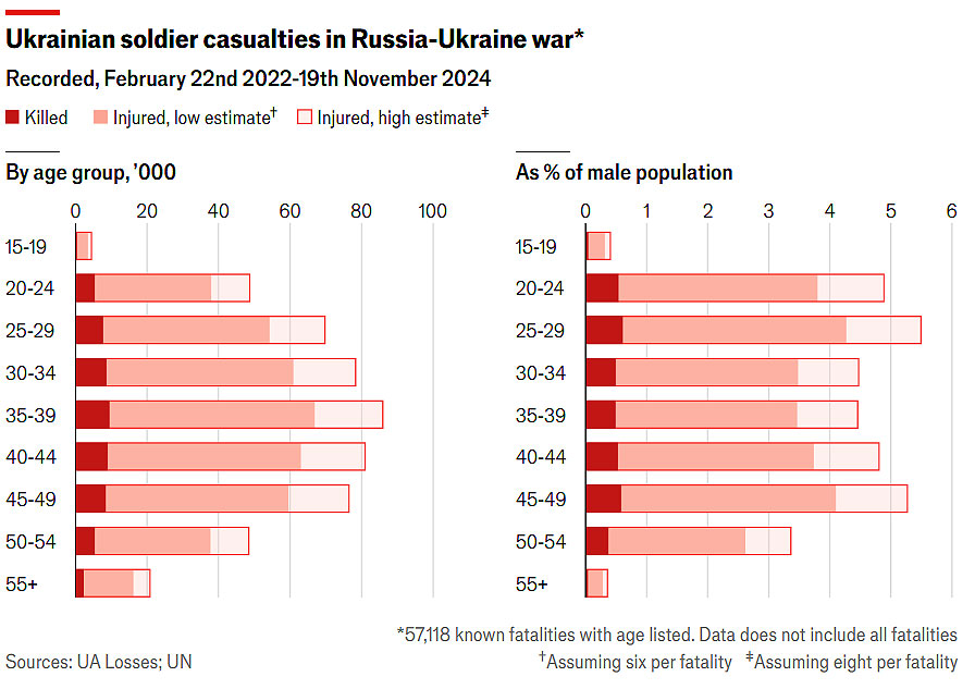 "Эти цифры свидетельствуют о том, что погибло более 0,5% довоенного населения Украины – мужчин призывного возраста (18-49 лет). Данные UAlosses не являются исчерпывающими, и возраст не всех солдат известен. Реальная доля мужчин, погибших на войне, выше. Еще больше доля тех, кто получил слишком тяжелые ранения, чтобы продолжать воевать. Если предположить, что на каждого погибшего в бою приходится 6-8 тяжелораненых, то почти каждый 20-й мужчина призывного возраста погиб или получил слишком тяжелые ранения, чтобы продолжать воевать", – пишет The Economist.