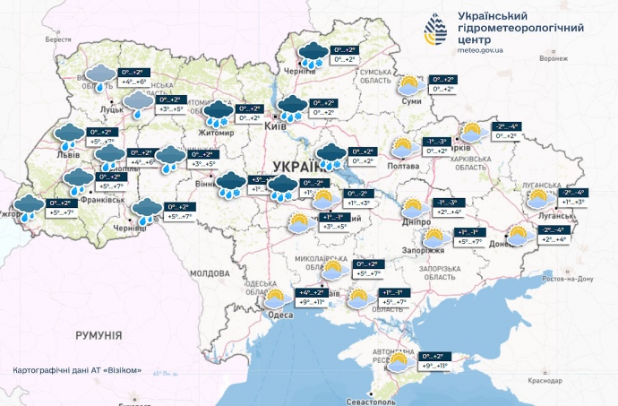 Дословно УГМЦ: "28 ноября ночью на Черниговщине, Сумщине и Харьковщине местами небольшой снег, днем в западных областях дождь, в Карпатах с мокрым снегом, на остальной территории без осадков; ночью и утром в западных, северных, Винницкой и Черкасской областях туман; температура ночью от 2° тепла до 3° мороза, днем от 1° мороза до 4° тепла, на крайнем западе страны, в Одесской области и в Крыму 5-10° тепла. Ветер северо-западный с переходом на юго-восточный, 5-10 м/с".