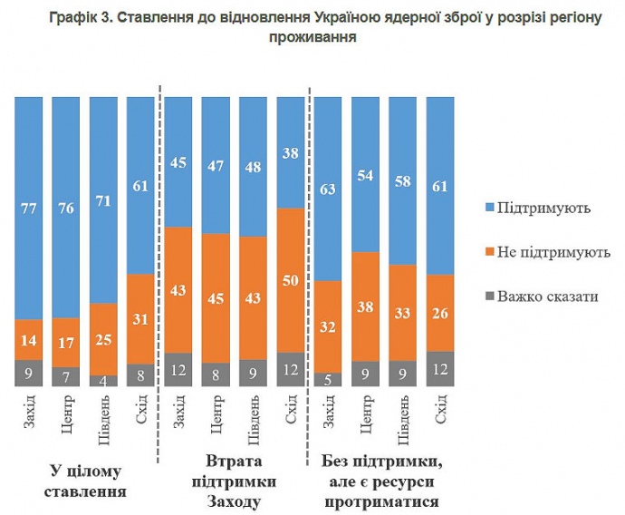 Детали: Однако если Украина будет иметь достаточно ресурсов, чтобы продержаться до момента получения ядерного оружия, то 58% готовы были бы пойти на потерю поддержки Запада с целью получения ядерного оружия. Не поддержали бы решение получить ядерное оружие при таком сценарии – 33%.