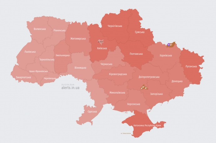 Ночью 25 декабря Воздушные силы Украины сообщили о взлете группы российских стратегических бомбардировщиков Ту-95МС. В 5:25 зафиксированы пуски крылатых ракет типа "Калибр" из Черного моря.