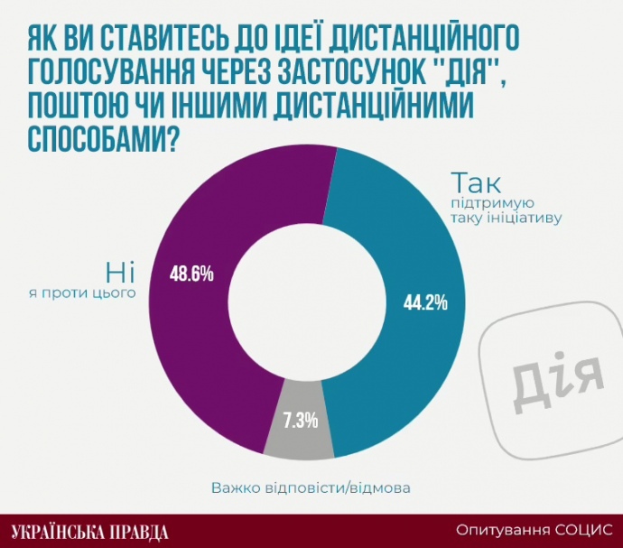 По данным опроса социологического центра "СОЦИС", который провели по просьбе "Украинской правды", идея дистанционного голосования через "Дію" или по почте разделила общество: 44,2% поддерживают инициативу, тогда как 48,6% выступают против. Основные опасения касаются рисков фальсификаций, хотя значительная поддержка есть для уязвимых категорий, таких как военные или жители прифронтовых территорий.