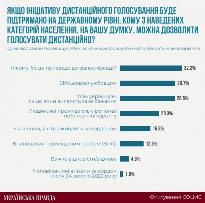Кроме того, 28,5% опрошенных выступают за возможность голосовать дистанционно не только для уязвимых групп, но и для всех украинцев в целом по их желанию.