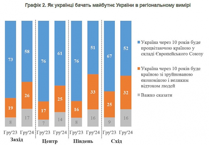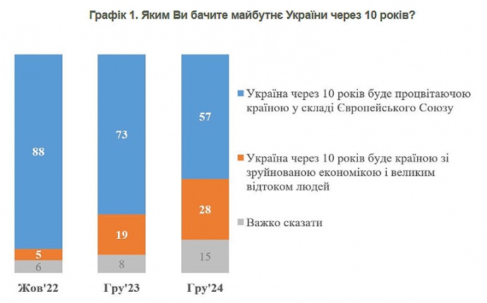 Дословно КМИС: "Есть устойчивая тенденция к снижению доли тех, кто оптимистично смотрит в будущее Украины. Если в конце 2022 года 88% считали, что Украина через 10 лет будет процветающей страной в ЕС, то к декабрю 2023 года их доля сократилась до 73%, а к декабрю 2024 года – до 57%".