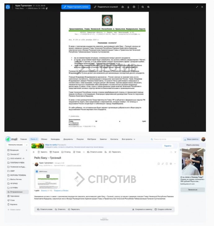 Центр национального сопротивления получил в свое распоряжение письмо представителя главы Чечни в Уральском федеральном округе РФ Турпала Ильясова с инструкцией, как комментировать катастрофу самолета "Азербайджанских авиалиний", который разбился в Казахстане.