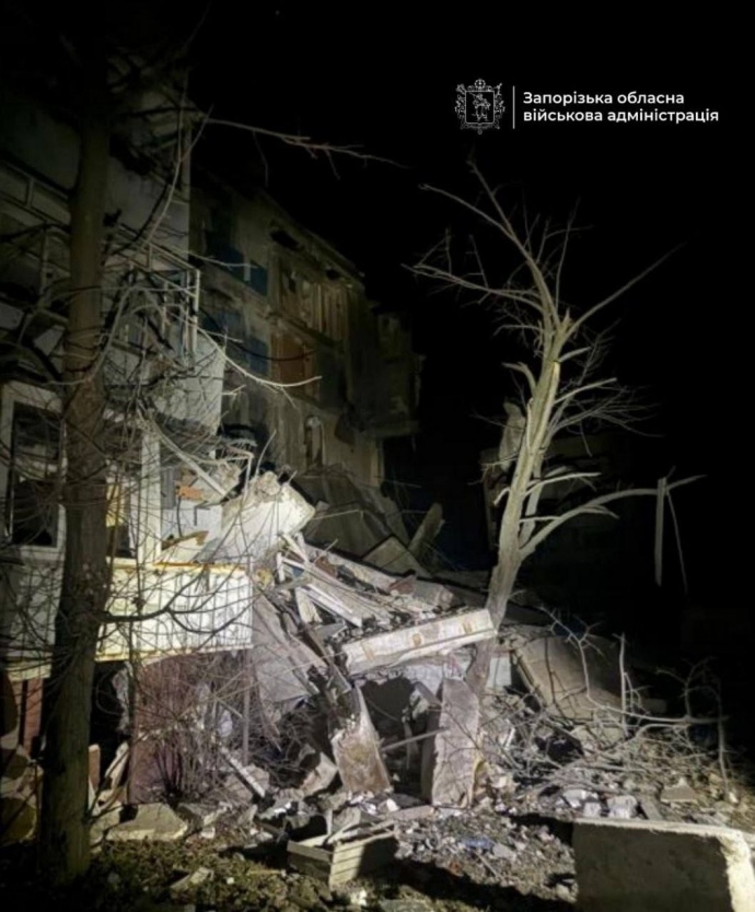 Ночью 2 января российские военные атаковали КАБАми Степногорск, что в Запорожской области, в результате чего разрушен 5-этажный дом и погиб человек.