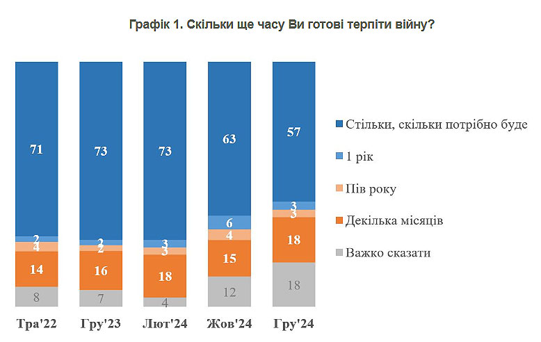 Количество украинцев, которые готовы нести бремя войны столько, сколько потребуется, уменьшается – по состоянию на декабрь 2024 года таких было 57%, что на 16 процентных пунктов меньше, чем в декабре 2023 года/феврале 2024 года.
