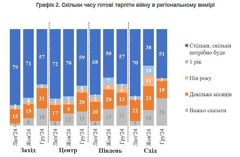 Социологи отмечают, что если между февралем 2024 года и началом октября 2024 года снижение запаса прочности прослеживалось прежде всего на Юге и (особенно) Востоке, то к декабрю 2024 года произошло "выравнивание" между регионами. Поэтому по состоянию на конец года разница между регионами стала значительно менее заметной (хотя на Востоке остается немного меньше тех, кто готов терпеть столько, сколько потребуется, а также выше неопределенность).