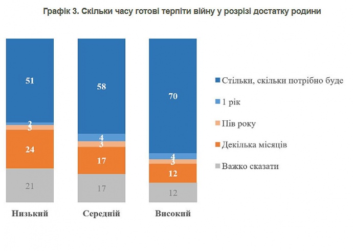 "Эти данные показывают, что готовность терпеть войну лишь частично связана с материальными условиями жизни и на самом деле другие факторы в большей степени влияют на запас прочности", – подытожили в КМИС.