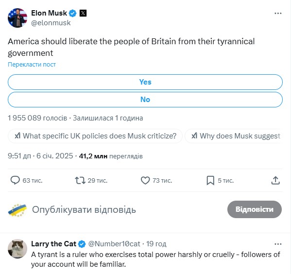 Американский миллиардер Илон Маск отреагировал на критику со стороны британского правительства, создав в своей соцсети X (Twitter) опрос, в котором предлагал пользователям ответить "да" или "нет" на вопрос, должны ли США "освободить народ Британии от тиранического правительства".