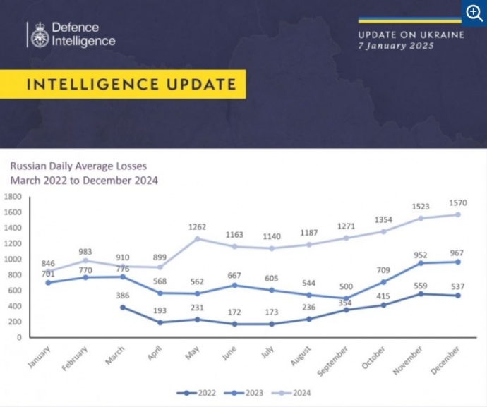 Британская разведка констатирует, что в 2024 году Россия, ведя пехотные атаки на многих направлениях, понесла рекордные потери убитыми и ранеными в войне против Украины, а месяцем наибольших потерь стал декабрь.
