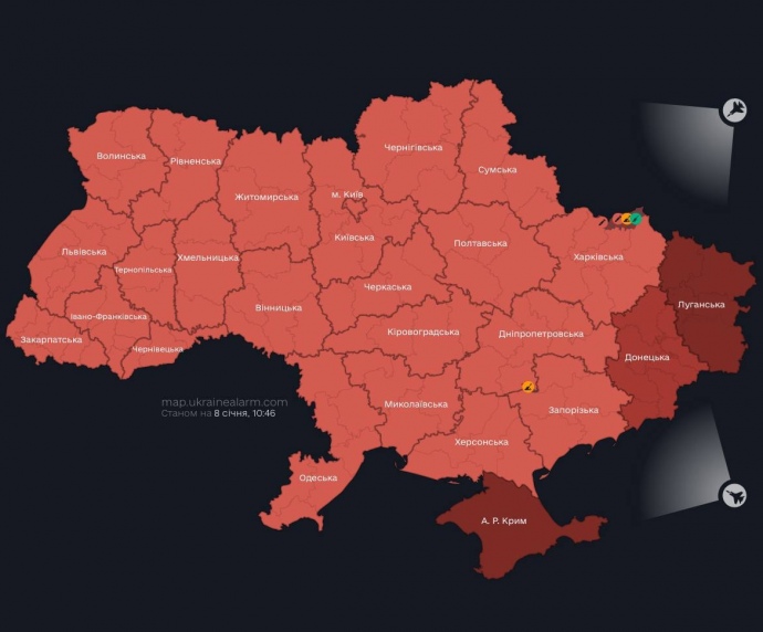 Утром 8 января Воздушные силы сообщали о воздушной тревоге из-за взлета в России истребителя МиГ-31К, который может нести ракеты "Кинжал".