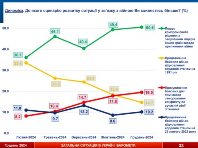 По результатам декабрьского опроса конца 2024 года, предоставленного УП, 50% украинцев склоняются к компромиссному решению с привлечением лидеров других стран для прекращения войны, однако со значительными гарантиями безопасности для Украины.