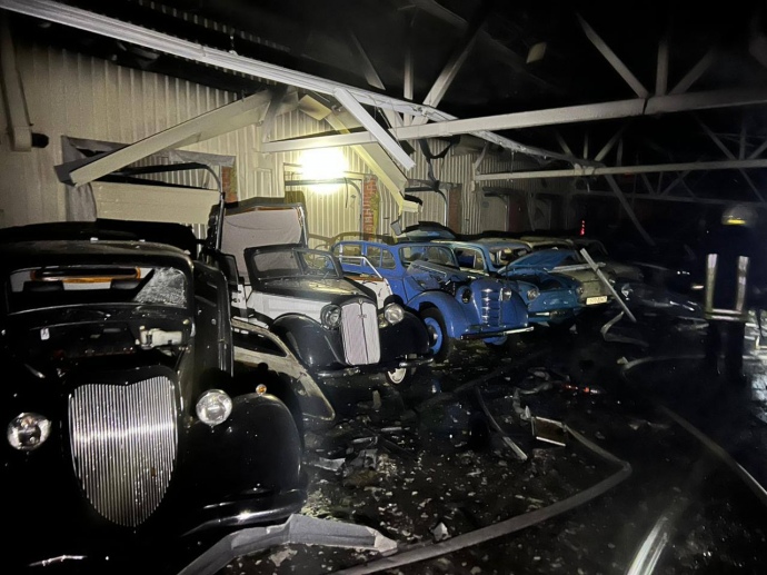 Прямая речь главы области: "В результате вражеской атаки БПЛА в области обломками сбитой цели повреждено помещение, в котором был расположен музей ретро-автомобилей. Работники ГСЧС потушили пожар на площади 600 м2. Предварительно, в ангаре уничтожено 9 транспортных средств и 27 повреждены".