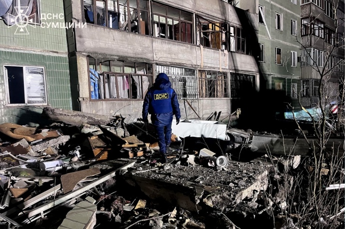 - Ночью 30 января российский беспилотник попал в многоэтажку в Сумах.