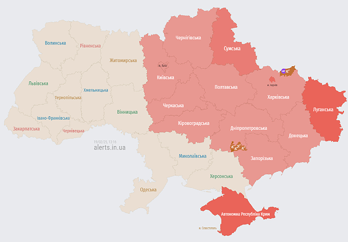 В столице и половине регионов Украины днем 19 февраля объявляли воздушную тревогу из-за угрозы применения Россией баллистического вооружения.