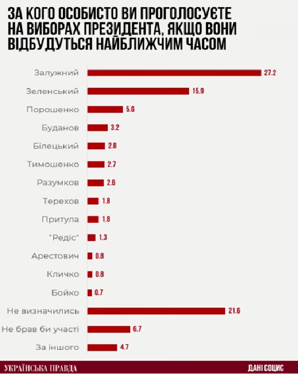Дословно: "В феврале, при условии баллотирования таких людей, как Валерий Залужный, Кирилл Буданов и много других новых имен из электоральной ниши военных, президент Зеленский уверенно держит второе место".