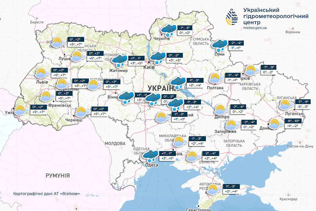 Детали: Температура в восточных, Сумской, Полтавской, Днепропетровской и Запорожской областях ночью 6-14° мороза, днем от 4° мороза до 1° тепла; на остальной территории ночью 0-7° мороза, на западе страны от 3° тепла до 2° мороза, днем 1-7° тепла.