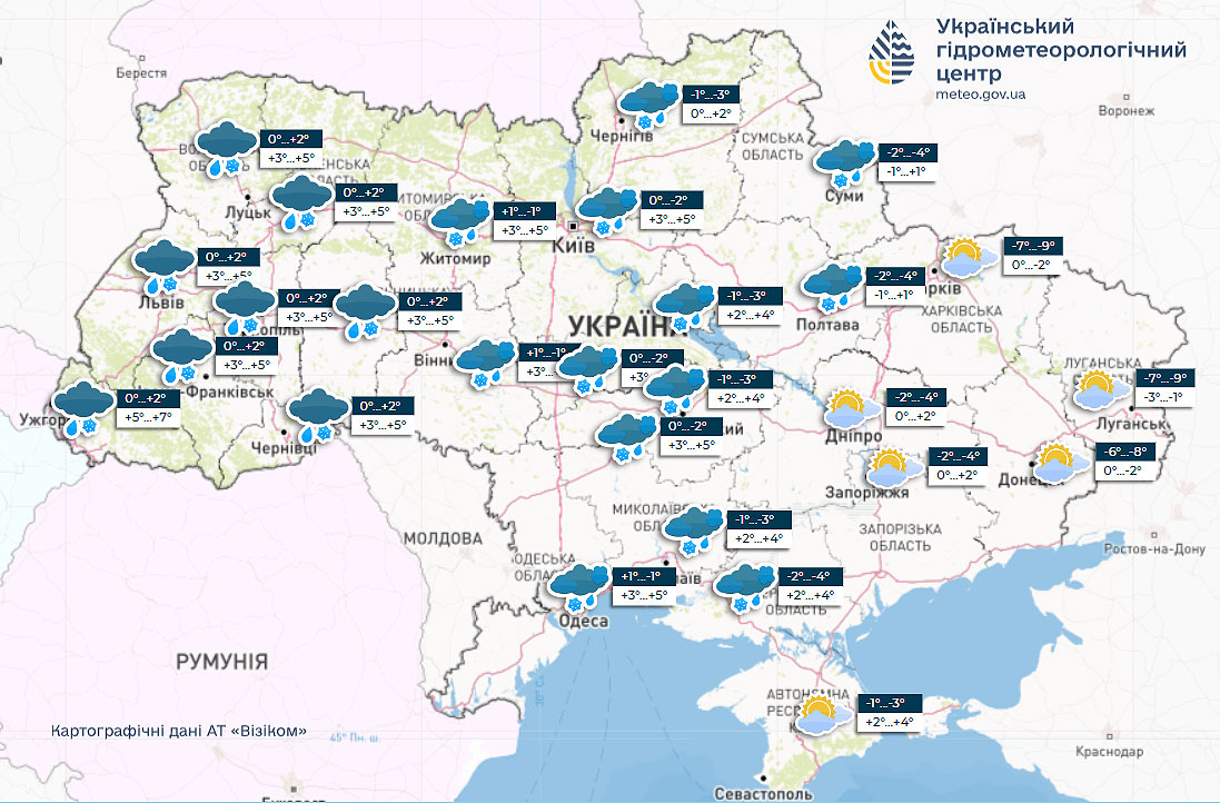 1 и 2 марта в Украине, кроме востока и юго-востока, небольшой мокрый снег и дождь. Температура на востоке страны ночью 6-9° мороза, днем от 4° мороза до 2° тепла, на остальной территории ночью 0-3° мороза, днем 1-7° тепла. Ветер южный и юго-восточный, 5-10 м/с.