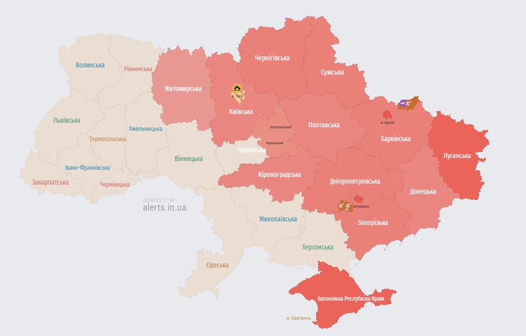 В Киеве в субботу вечером противовоздушная оборона работает по вражеским беспилотникам, во многих областях объявлена воздушная тревога.