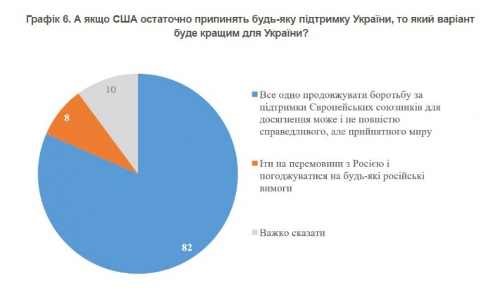 Дословно: "Среди украинцев есть однозначный консенсус, что Украина несмотря ни на что должна продолжать борьбу - 82%. Лишь 8% респондентов ответили, что в таких условиях они больше склоняются к принятию капитуляции.