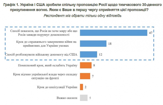 Детали: Социологи отмечают, что опрашиваемым предлагали 6 трактовок идеи 30-дневного перемирия, среди которых 3 условно положительные для Украины и 3 – условно негативные. Респондент должен был выбрать один ответ.