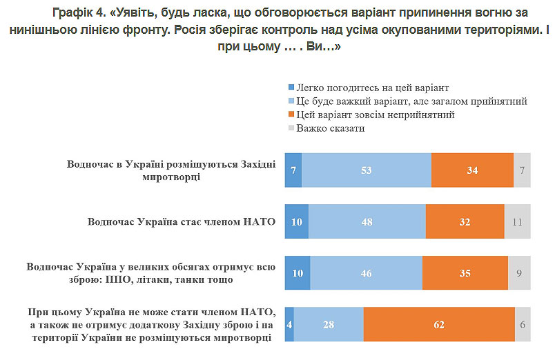 "Если же Украина получит по крайней мере определенные гарантии безопасности, то более половины украинцев (хотя и неохотно) поддержат прекращение огня. При этом разница между различными вариантами гарантий (с точки зрения поддержки от украинской общественности) – довольно незначительная", – отмечают в КМИС.