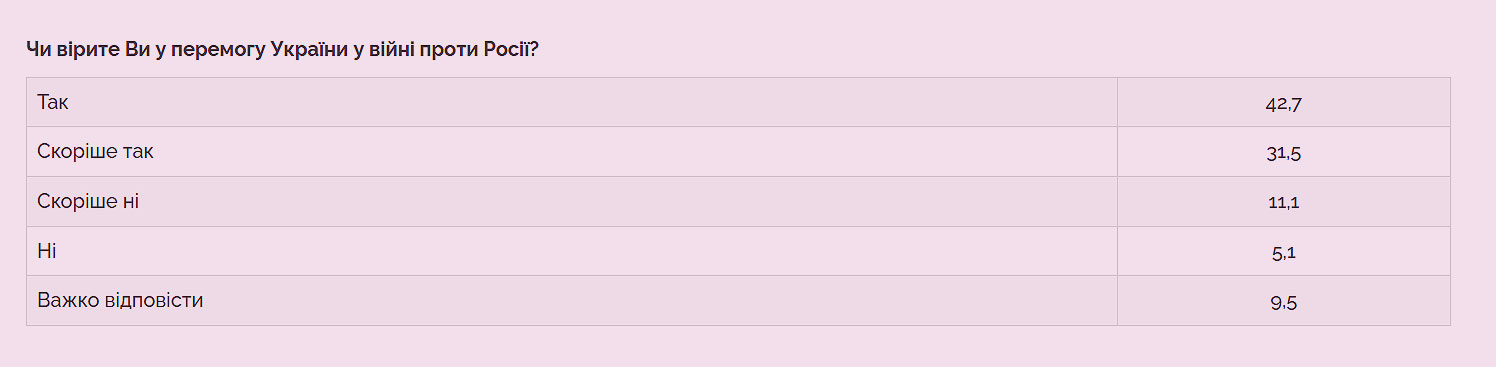 Дословно социологи: "74% опрошенных верят в победу Украины в войне (56% жителей Юга страны, 67% жителей Восточного региона, 79% жителей Центрального региона и 81,5% жителей Западного региона), не верят – 16% (11% в Западном регионе, 14% – в Центральном, 23% – в Восточном и 24% на Юге страны)".