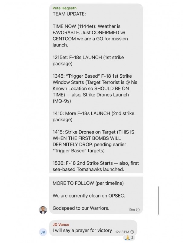 В обнародованных текстах Хэгсет подробно описывает время начала операции и время первых ударов. Через несколько минут после первого прицельного удара советник по вопросам национальной безопасности Майк Уолтц предоставил подробную информацию о нанесенном ущербе и некоторые сведения о том, кто из лидеров хуситов был поражен.