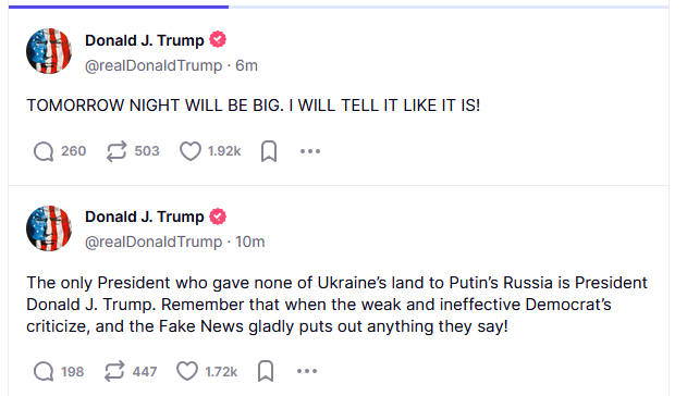Детали: Президент США пообещал рассказать "все как есть" ближайшей ночью. "Завтрашняя ночь будет большой. Я расскажу все как есть!", - написал Трамп.