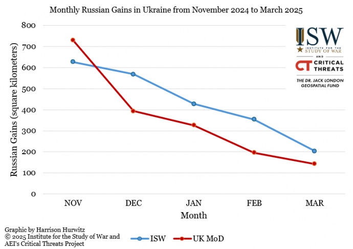 По данным Института изучения войны (ISW) темпы российского наступления в Украине стабильно снижаются. За март 2025 года российские силы продвинулись лишь на 143 квадратных километра, что является самым низким показателем за последние пять месяцев.
