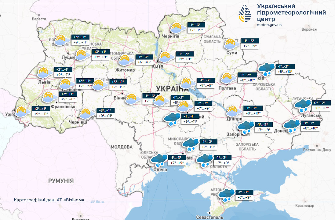 Дословно УГМЦ: "11 апреля в Украине, кроме северных и Винницкой областей, мокрый снег, днем местами с дождем, в Херсонской, Николаевской и Кировоградской областях ночью и утром значительный мокрый снег и налипание мокрого снега, в субботу на юге и востоке, ночью и на западе страны небольшой мокрый снег и дождь, на остальной территории без осадков".