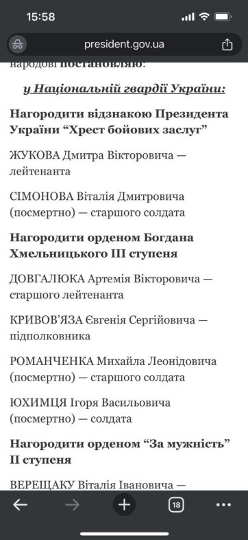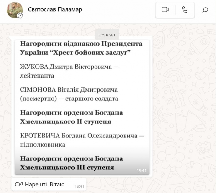 В среду, 9 апреля 2025 года, друг Калина, заместитель командира бригады, поздравил меня, прислав скриншот с официального сайта президента, где я был в списке награжденных.