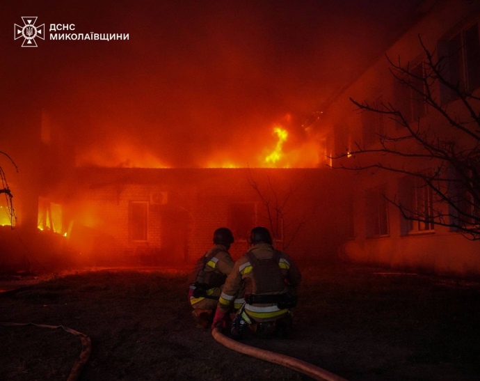 Гасіння пожежі складів після ворожої дронової атаки на Миколаїв.